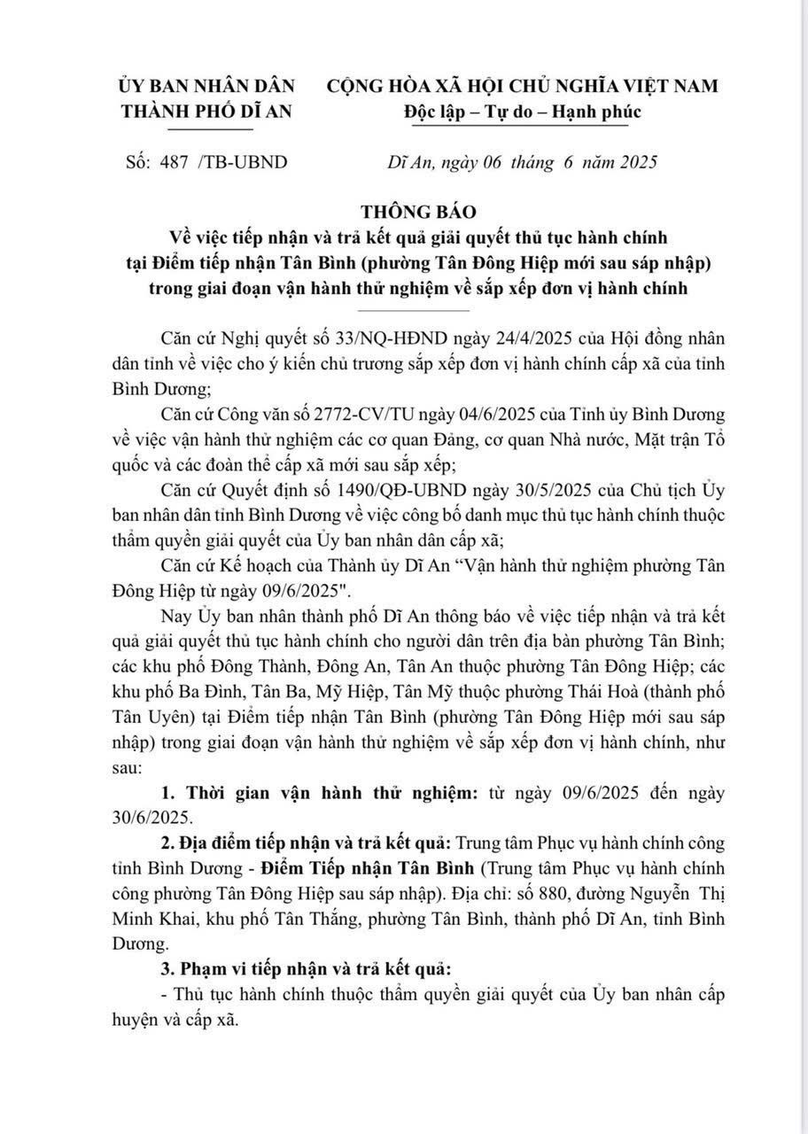 THÔNG BÁO Về việc tiếp nhận và trả kết quả giải quyết thủ tục hành chính tại Điểm tiếp nhận Tân Bình (thuộc phường Tân Đông Hiệp mới sau sáp nhập) Trong giai đoạn vận hành thử nghiệm sắp xếp đơn vị hành chính.