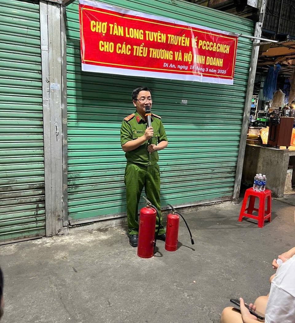Đội Chữa cháy và Cứu nạn cứu hộ khu vực Thành phố Dĩ An thuộc Phòng Cảnh sát PCCC và Cứu nạn cứu hộ Công an tỉnh Bình Dương vừa phối hợp với Công an phường Tân Đông Hiệp tổ chức tuyên truyền PCCC cho 60 tiểu thương tại chợ Tân Long.