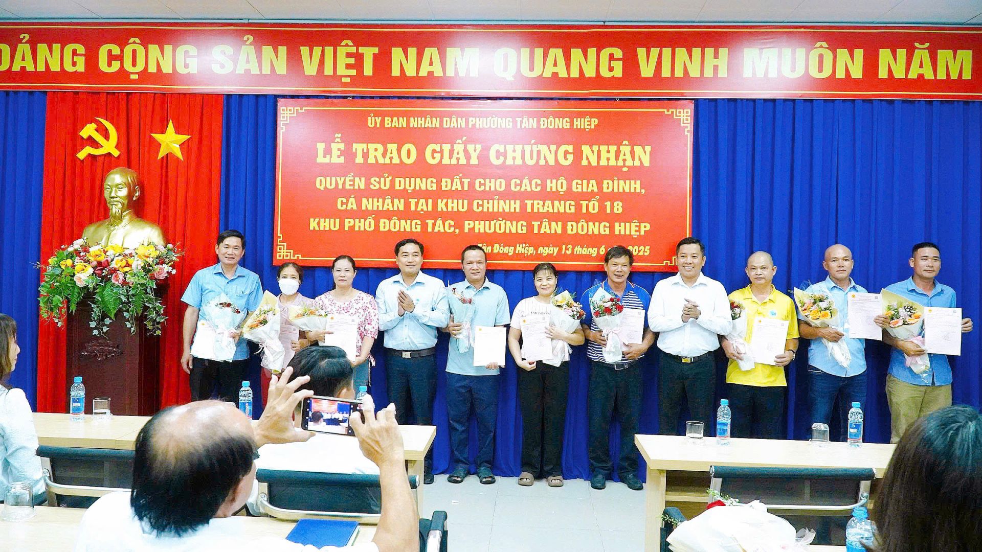 Chiều ngày 13/6, UBND phường Tân Đông Hiệp đã tổ chức Lễ trao giấy chứng nhận quyền sử dụng đất cho các hộ dân ngụ tại tổ 18, khu phố Đông Tác.
